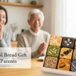 暖かみのあるダイニングで、女性が男性にリボン付きのパンのギフトボックスを手渡すシーン。背景では家族が食卓を囲んで笑顔でパンを食べているイラスト。ボックスには「With Care & Love」のタグが添えられ、贈答用パンの温かいコミュニケーションを表現。